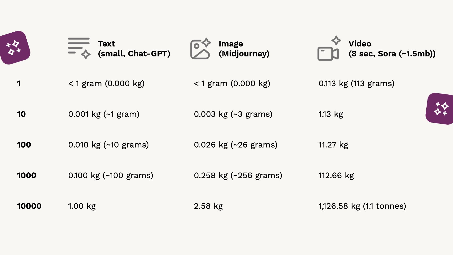 The session provided practical context for the carbon impact of AI content generation. For example, generating 1,000 short text responses with a model like ChatGPT produces around 100 grams of CO2e, while 1,000 image generations with Midjourney equate to roughly 258 grams. Video generation is significantly more intensive: 1,000 short (8-second) videos using Sora can result in just over 112 kg of CO2e.
